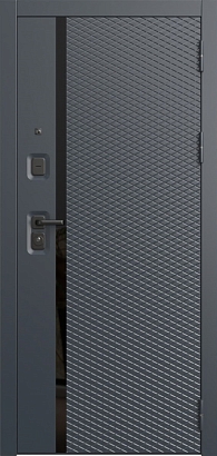 | Особенности | Входная металлическая дверь с внешним покрытием из фрезерованной МДФ-панели (16 мм) в цвете «Шагрень графит мягкая», с Г-образным наличником и внутренним покрытием из фрезерованной МДФ-панели в цвете «Шагрень белая мягкая», с зеркалом. Покраска металла: муар черный. |