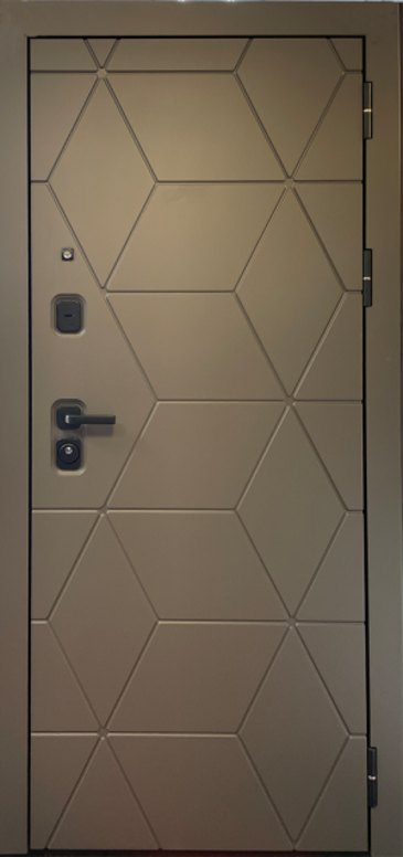 | Особенности | Входная металлическая дверь с внешним покрытием из фрезерованной МДФ-панели (16 мм) в цвете «Шагрень графит мягкая», с Г-образным наличником и внутренним покрытием из фрезерованной МДФ-панели в цвете «Шагрень белая мягкая», с зеркалом. Покраска металла: муар черный. |